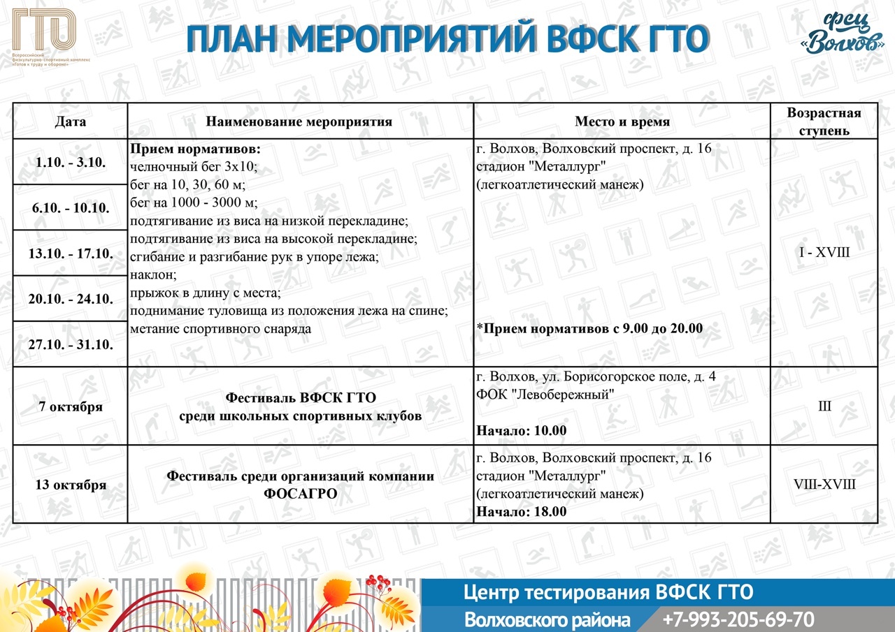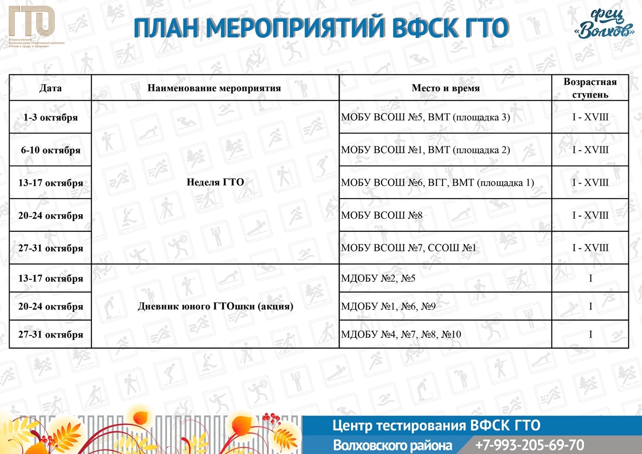 Центр тестирования ГТО в Волховском районе приглашает принять участие в выполнении нормативов комплекса ГТО и знакомит вас с планом мероприятий ГТО на октябрь 2025 года.