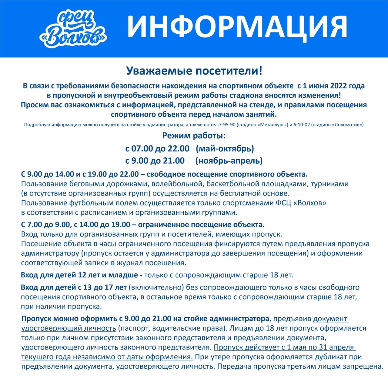 Внесены изменения во внутреобъектовый и пропускной режимы спортивных объектов для разграничения потоков посетителей и выполнения требований безопасности, которые вступят в силу с 1 июня. Если у вас остались вопросы- мы готовы ответить на них по указанным телефонам.